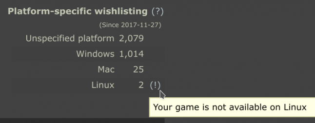 Developers on Steam now have a new set of data to consider when studying statistics for their existing Steam listings. Valve now displays new wishlist-driven statistics that break down the number of times a game has been wishlisted into either Windows, Mac, Linux, or unspecified platform categories.